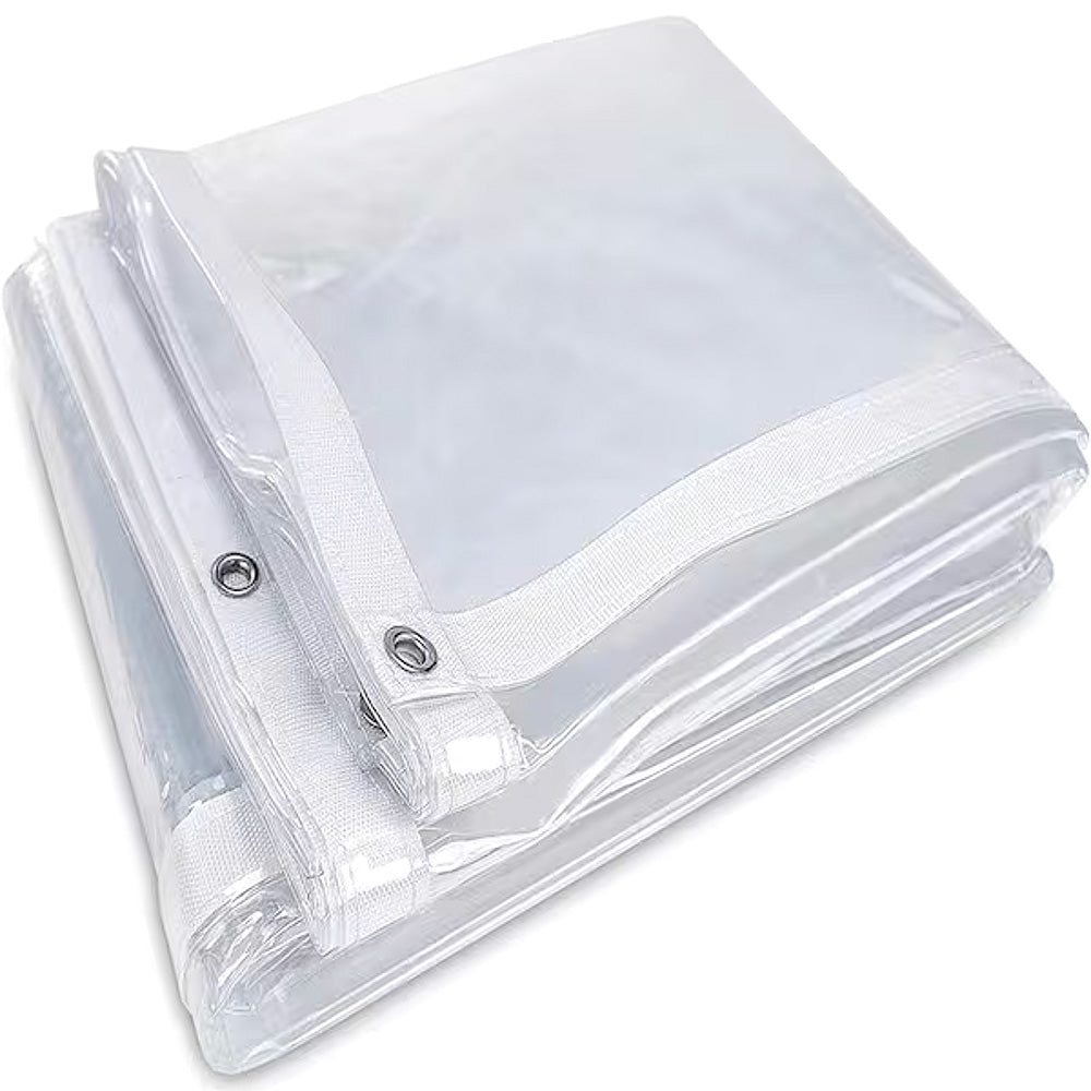 The Clear Vinyl Tarps from TarpUSA™ offer a window-clear view with no thread lines to obstruct vision. Clear tarps are typically used for canopy tent sidewalls, storm windows, porch enclosures and industrial protection. These clear vinyl tarps are 30 mil thick and have a weight 27 ounce per square yard. Our clear tarps are Made-In-The-USA from vinyl material with a reinforced white hem.